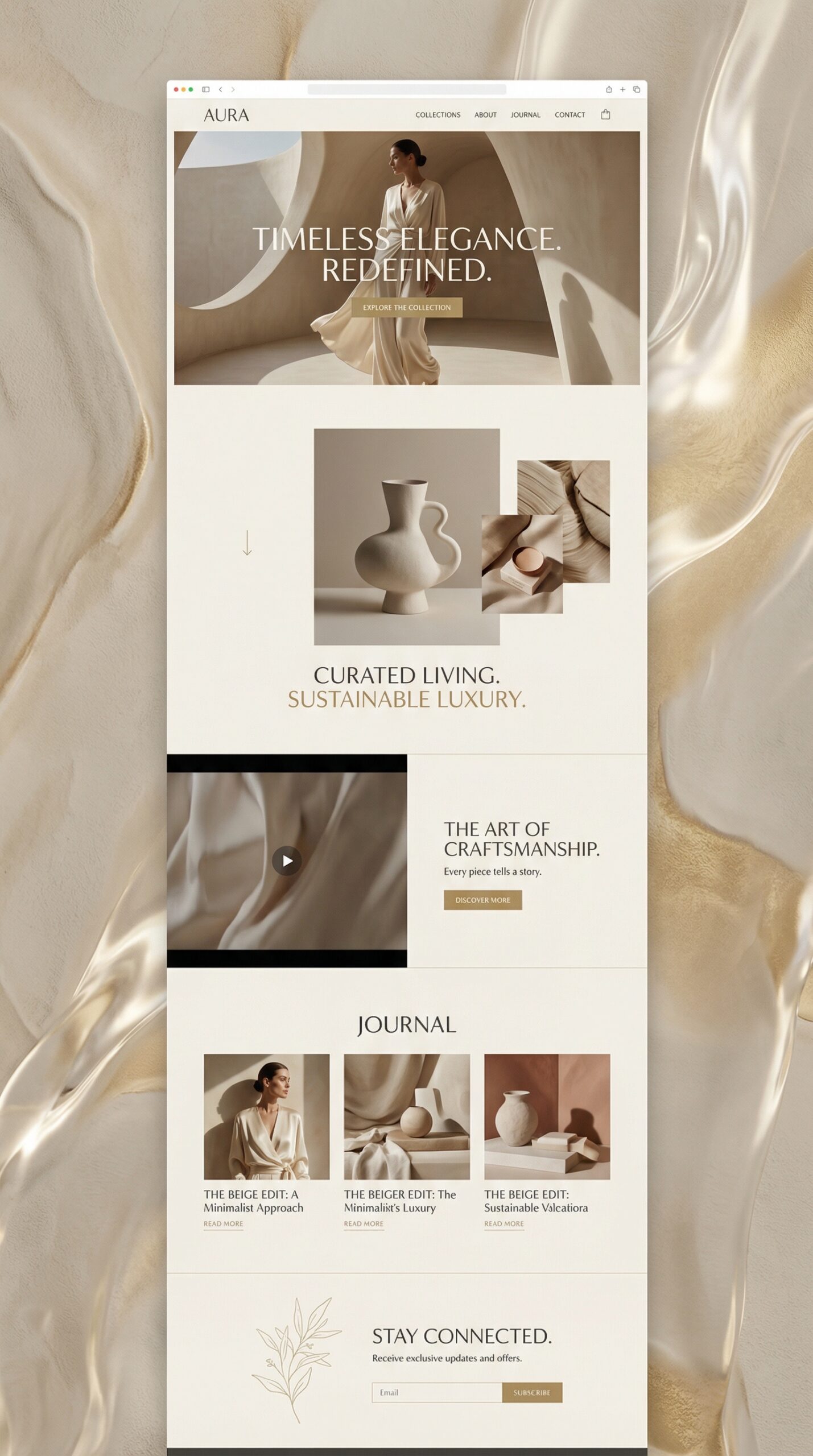 Introducing a stunning website template designed for brands focused on timeless elegance and sustainable luxury. This sophisticated layout features a harmonious blend of soft beige and earthy tones, creating a warm and inviting atmosphere. The clean lines and minimalist design enhance user experience, allowing visitors to explore captivating collections effortlessly. Ideal for lifestyle brands, boutique designers, or artisanal crafts, this template showcases your products with grace. The spacious sections and elegant typography add an air of refinement, ensuring your brand stands out. Elevate your online presence with a design that embodies sophistication and modernity, perfect for the discerning customer.