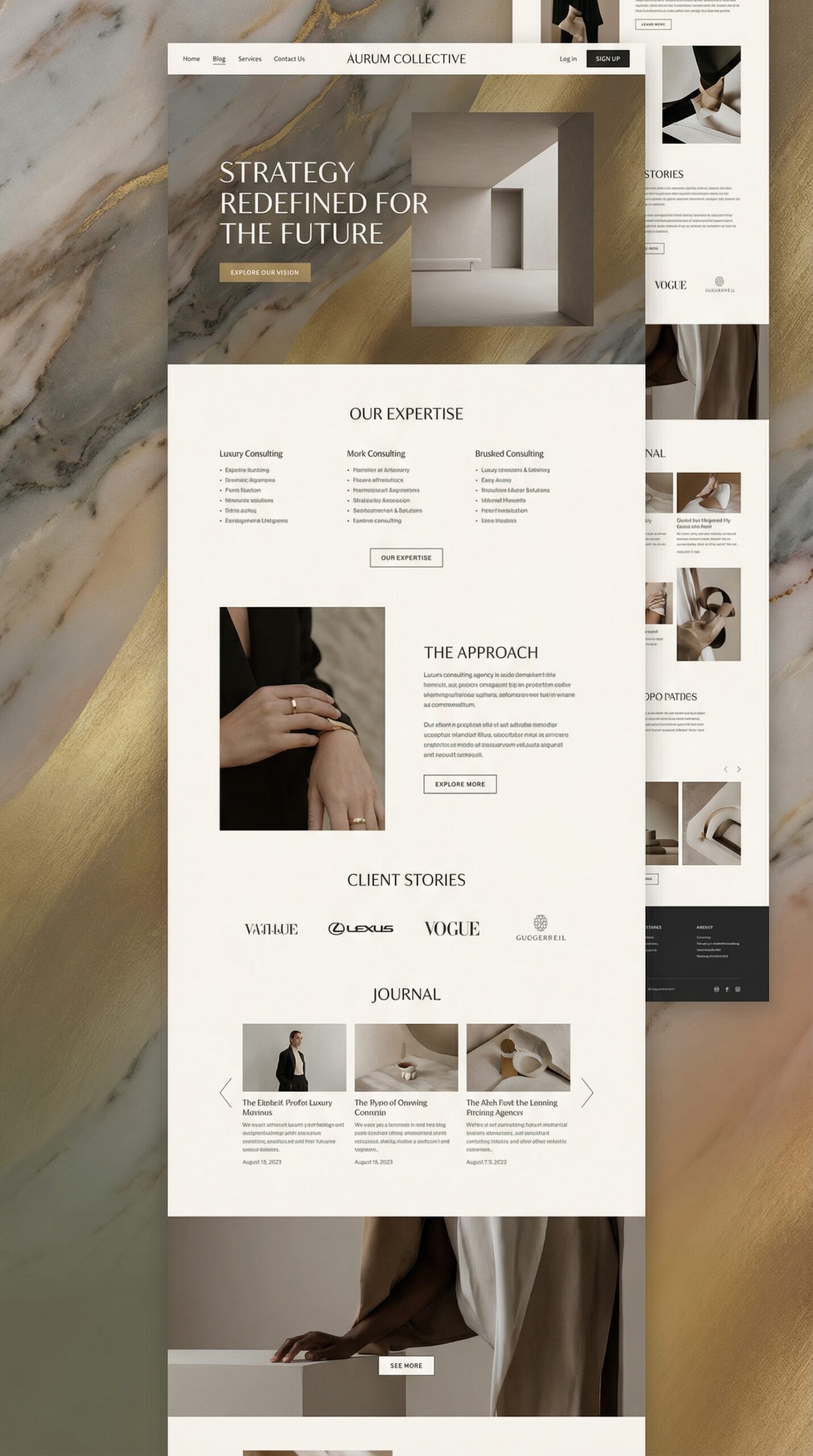 Introducing the **Aurum Collective** website template, a sophisticated and modern design perfect for luxury consulting agencies, fashion brands, or creative firms. This template features an elegant color palette of soft neutrals complemented by striking gold accents, creating a sense of opulence and refinement. The clean layout and intuitive navigation ensure a seamless user experience, while high-quality images highlight clients’ projects beautifully. With its emphasis on storytelling and expert guidance, this design effectively conveys professionalism and innovation. Elevate your online presence and captivate your audience with this stunning website template tailored for success.
