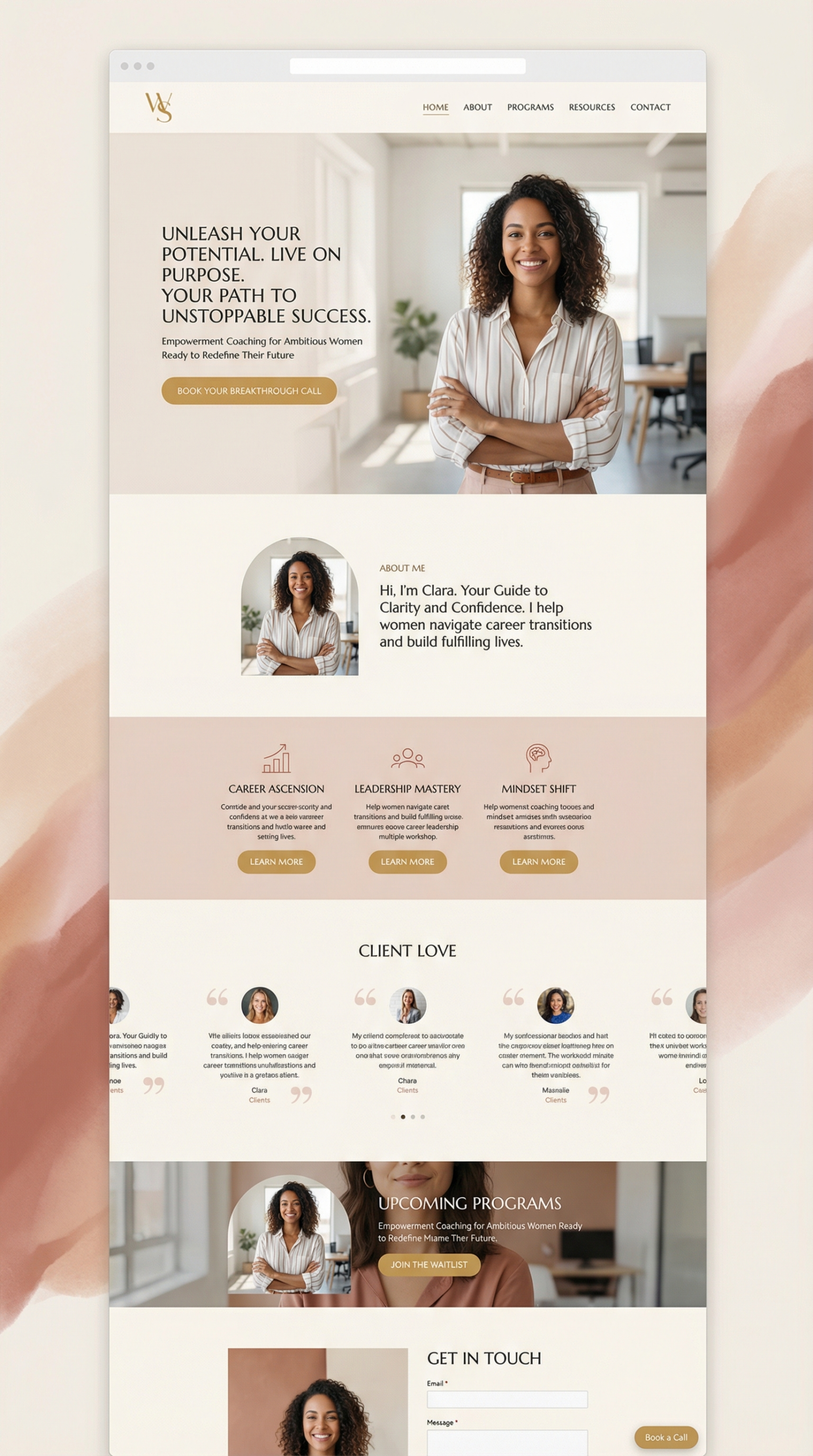 This elegant website template is designed for ambitious women seeking empowerment and personal growth. With a sophisticated color palette of soft neutrals and warm earth tones, it exudes a welcoming and inspiring atmosphere. The layout is clean and visually appealing, featuring striking images and clear calls to action that invite engagement. Ideal for coaching services, this design prioritizes clarity and confidence, guiding users through essential information effortlessly. The combination of modern typography and a refined aesthetic ensures that your message resonates, helping clients unlock their potential and embrace their future. Perfect for professionals aiming to make a meaningful impact.