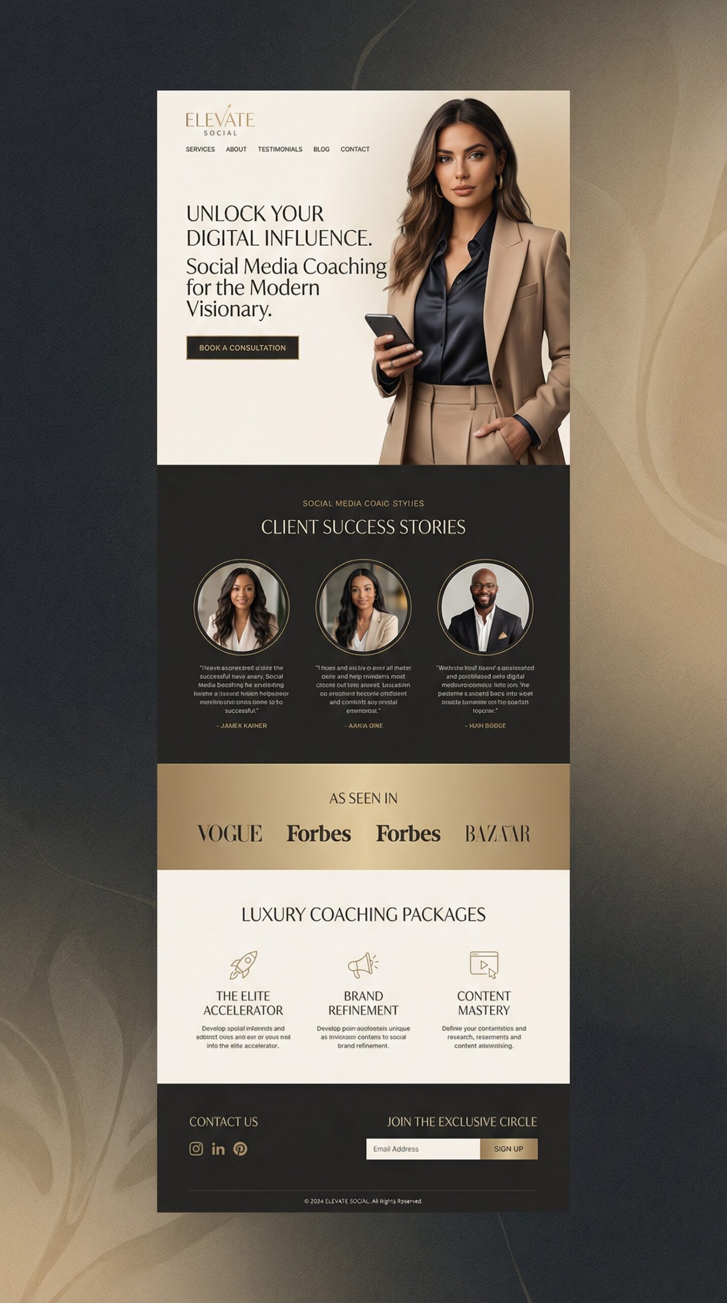 This website template is designed for high-end social media coaching services, appealing to modern visionaries looking to enhance their digital influence. Its elegant color palette features luxurious shades of gold, black, and soft beige, creating a sophisticated and inviting atmosphere. The layout is clean and professional, showcasing client success stories effectively while maintaining a balance of visual elements. The design integrates clear calls to action, making it user-friendly and engaging. Perfect for entrepreneurs and brands aiming to establish a strong online presence, this template communicates professionalism and prestige, ensuring users feel inspired and motivated to elevate their social media strategies.