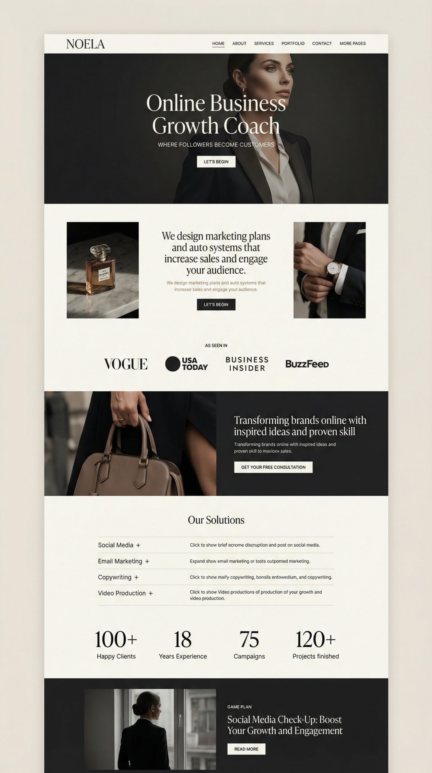 Introducing a sleek and modern website template, perfect for online business coaches and entrepreneurs focused on growth. The design features a sophisticated palette of deep blacks and crisp whites, exuding professionalism and elegance. With bold typography and striking visuals, the layout draws in visitors while clearly highlighting your services. The responsive sections cater to showcasing testimonials, experience, and successful case studies, enhancing credibility. This template is designed to engage and convert, making it an exceptional choice for anyone looking to elevate their online presence and effectively connect with their audience. Boost your brand with this stunning design!