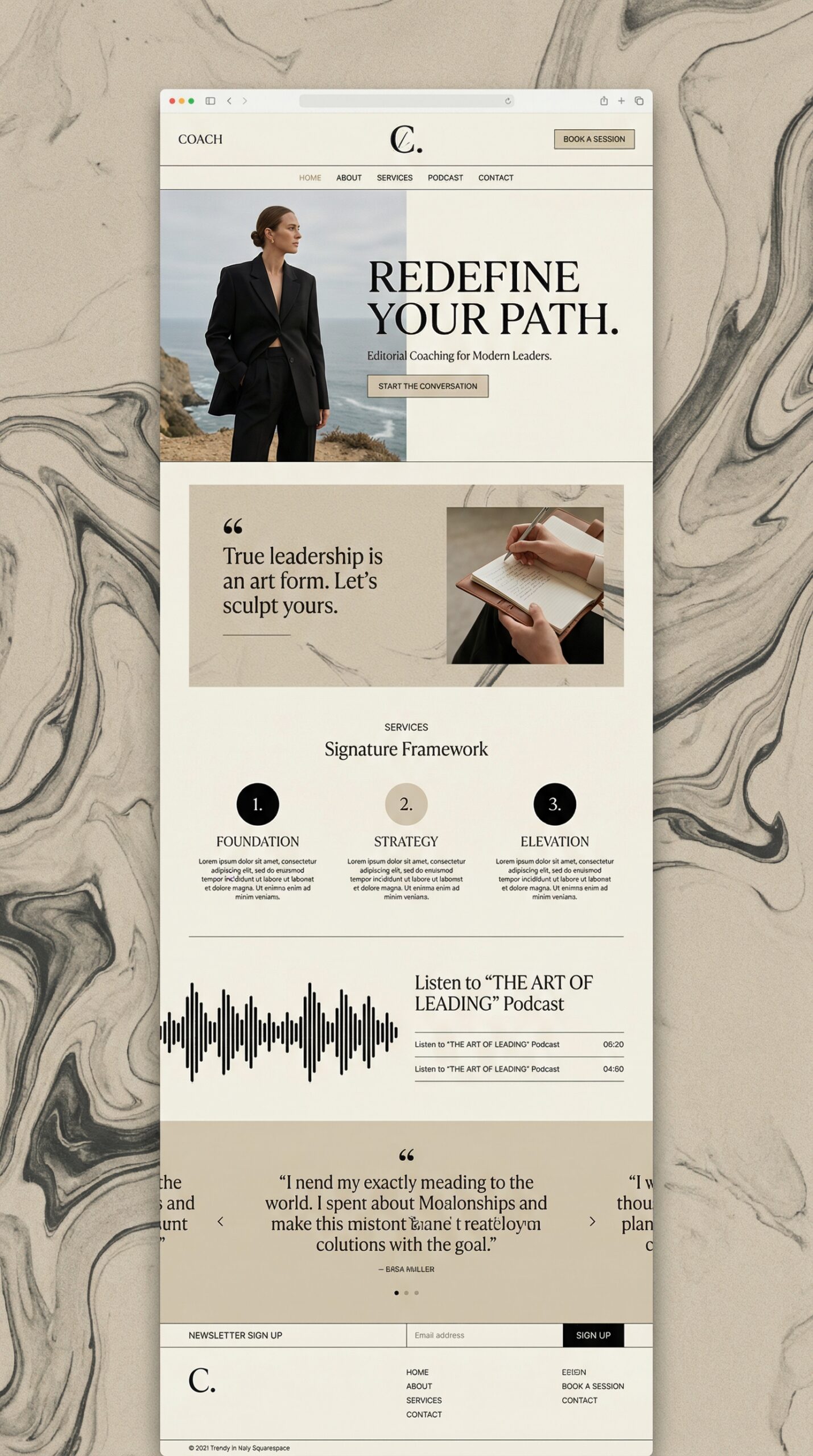 This stunning website template is perfect for modern coaches, consultants, or creative entrepreneurs aiming to make a strong impact. Featuring an elegant color palette of soft beige, muted gold, and deep black, it creates a sophisticated and professional atmosphere. The visuals and typography are clean, allowing for easy navigation while evoking a sense of trust and authority. This design is tailored to reflect professionalism and creativity, making it ideal for showcasing services, testimonials, and podcasts. With its refined aesthetic and user-friendly layout, this website template is an exceptional choice for anyone looking to elevate their online presence.