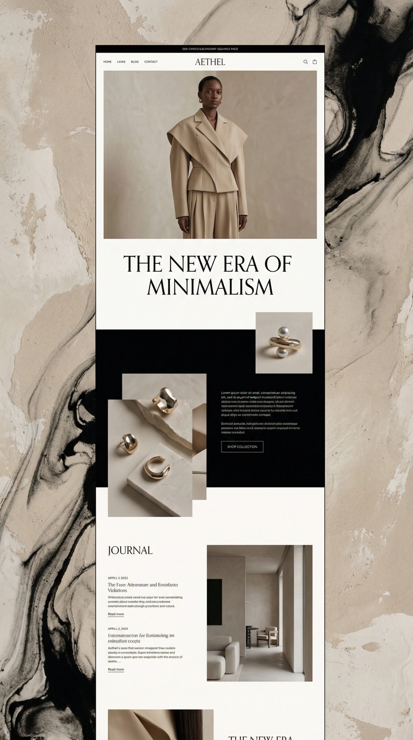 This website template embodies the essence of minimalist elegance, perfect for fashion, jewelry, or contemporary design brands. The color palette features soft neutrals and bold blacks, creating a sophisticated and timeless feel. The layout promotes clarity and visual appeal, allowing your products to shine. With large imagery and striking typography, this design expertly captures attention while providing an immersive experience. Ideal for showcasing a curated collection, the intuitive navigation ensures a seamless user journey. Elevate your brand’s online presence with this sophisticated template that balances modern aesthetics with functionality, inviting users to explore and engage with your offerings.