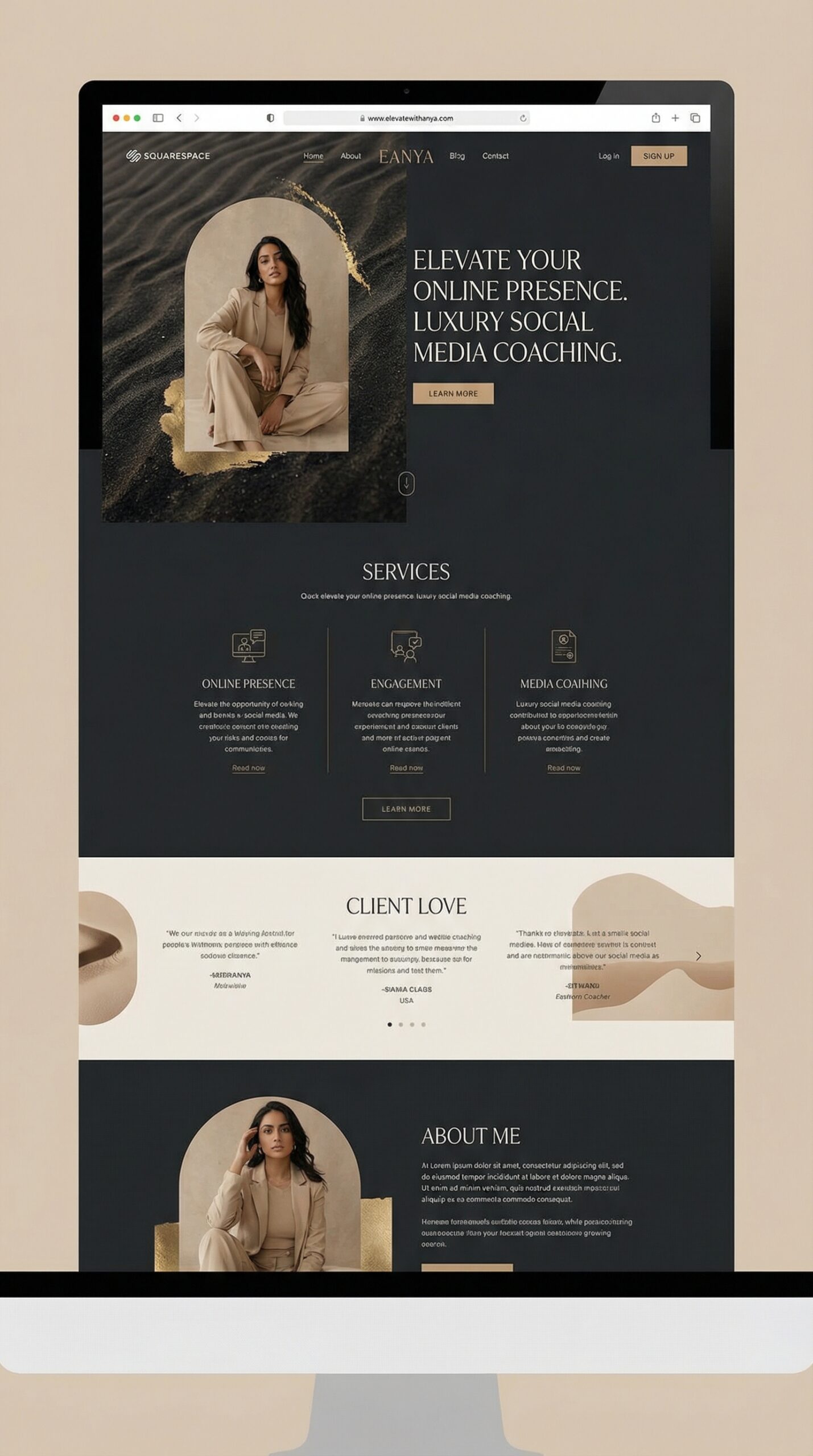 This elegant website template is perfectly suited for luxury brands and service providers focused on personal branding, such as coaches and consultants. With a sophisticated color palette of dark tones accented by gold and neutral shades, it exudes a sense of professionalism and refinement. The clean layout enhances user experience, drawing attention to essential services and testimonials that build trust. The modern typography and imagery create a warm, inviting atmosphere, encouraging visitors to explore further. This design not only elevates your online presence but also positions you as a leader in your industry, making it an excellent choice for those seeking to make a lasting impression.