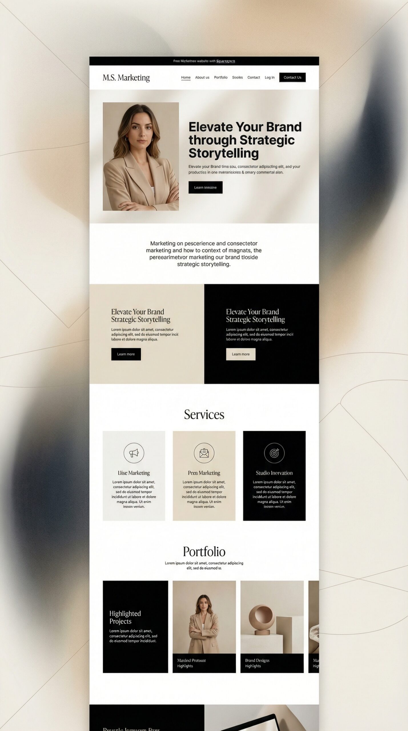 This modern website template is designed for marketing professionals and creative agencies looking to elevate their brands. Featuring a sleek black and beige color scheme, it exudes sophistication and professionalism. The layout is clean and intuitive, enhancing user experience while effectively showcasing services and portfolios. High-quality imagery paired with elegant typography creates an inviting atmosphere, emphasizing strategic storytelling. Ideal for businesses wanting to make a strong impression, this template ensures a perfect blend of aesthetics and functionality, driving engagement and conversions. Elevate your brand presence with this captivating and user-friendly design.