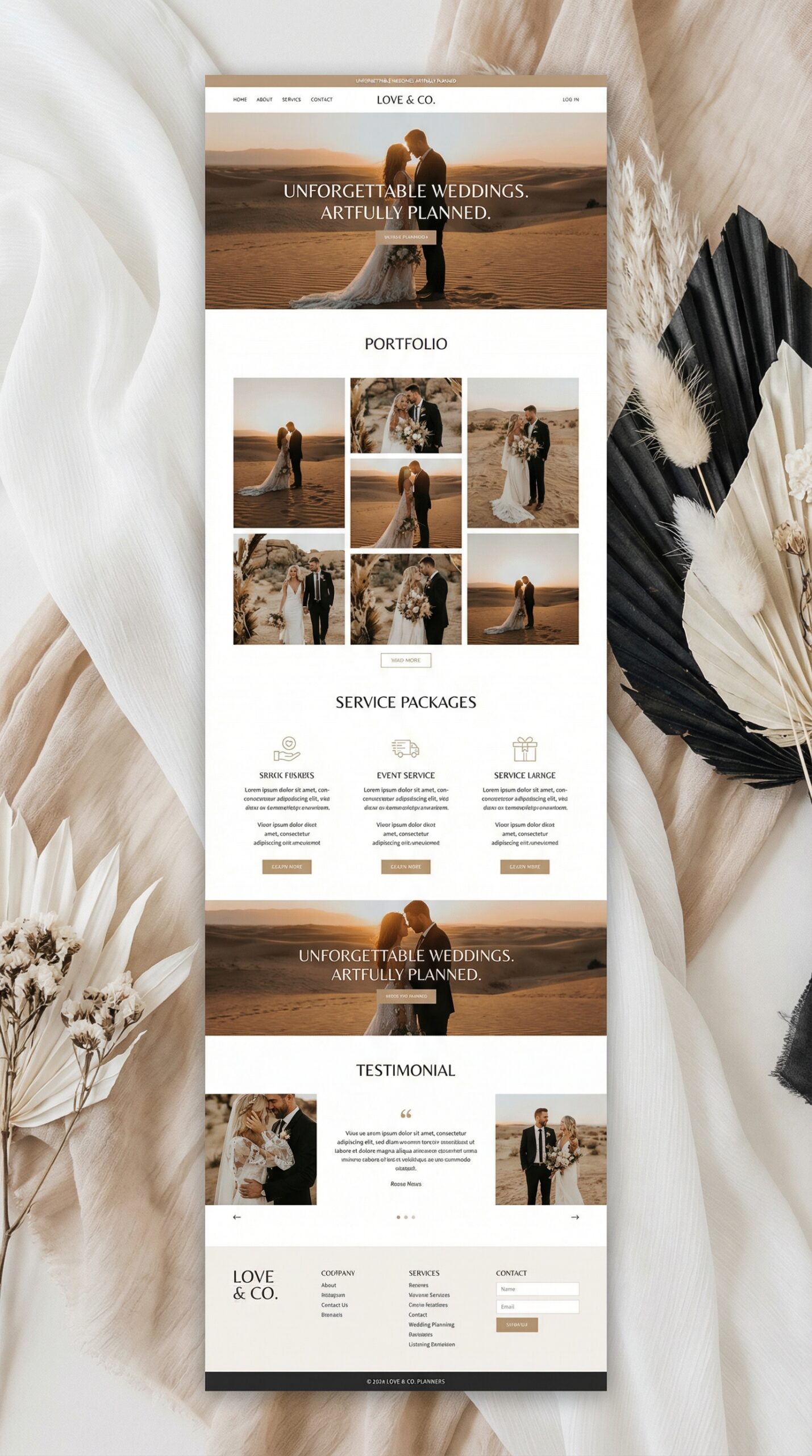 This elegant website template is crafted for wedding planners and event coordinators, perfectly suited for showcasing unforgettable moments. The palette combines soft earthy tones with warm gold accents, creating a sophisticated and inviting atmosphere. The clean layout emphasizes stunning imagery, allowing couples to envision their dream weddings effortlessly. With clearly defined sections for portfolios, services, and testimonials, navigating the site is intuitive, enhancing user experience. This design not only exudes romance and luxury but also builds trust, making it an ideal choice for professionals in the wedding industry who aim to impress and connect with their clients.