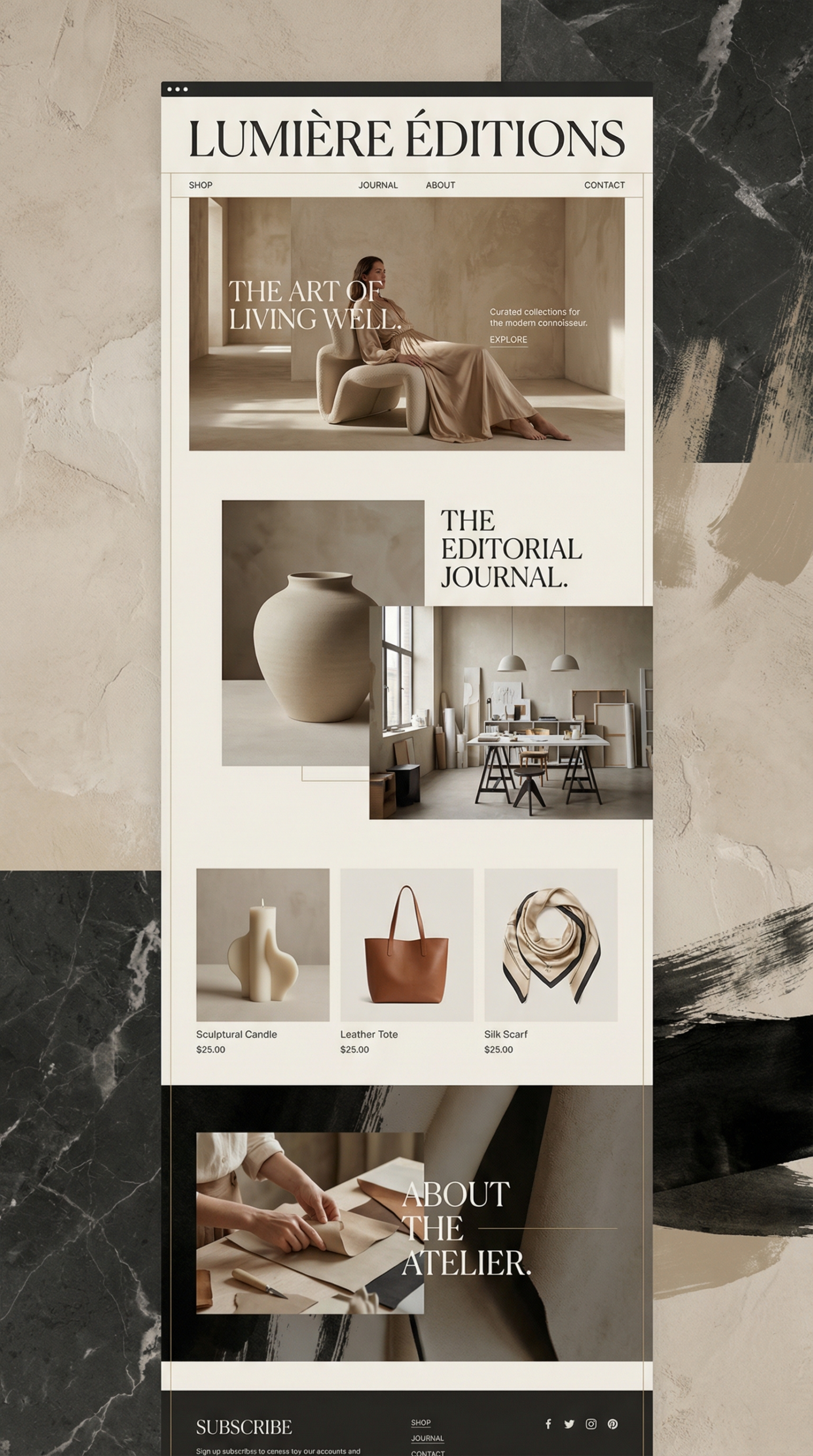 This elegant website template is perfect for boutique brands, lifestyle coaches, or artistic portfolios. Featuring a sophisticated color palette of warm neutrals, soft beige, and deep black accents, it exudes a calm, inviting aesthetic. The layout is clean and modern, allowing products and content to shine without distraction. Typography combines elegance with readability, making it easy for visitors to engage with the material. This design enhances the user experience, encouraging exploration through visually appealing sections. Ideal for those looking to convey luxury and artistic sensibility, this website template will elevate your online presence and captivate your audience.