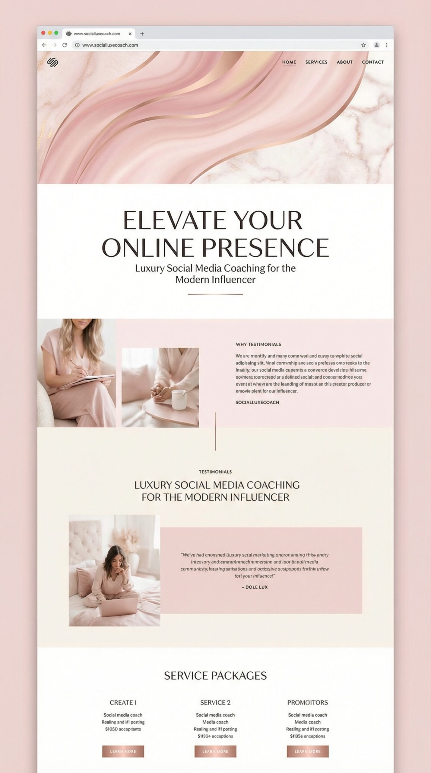 This elegant website template is perfect for modern influencers and luxury brands seeking to enhance their online presence. Featuring soft pastel colors—like blush pink and subtle beige—it creates a warm, inviting atmosphere that exudes sophistication and professionalism. The layout is clean and well-structured, making navigation intuitive for visitors. With stylish typography and beautifully integrated imagery, this design captures attention while conveying trust and expertise. Ideal for social media coaching services, this template not only elevates your brand’s image but also engages potential clients effectively, ensuring that your message resonates in a competitive digital landscape.