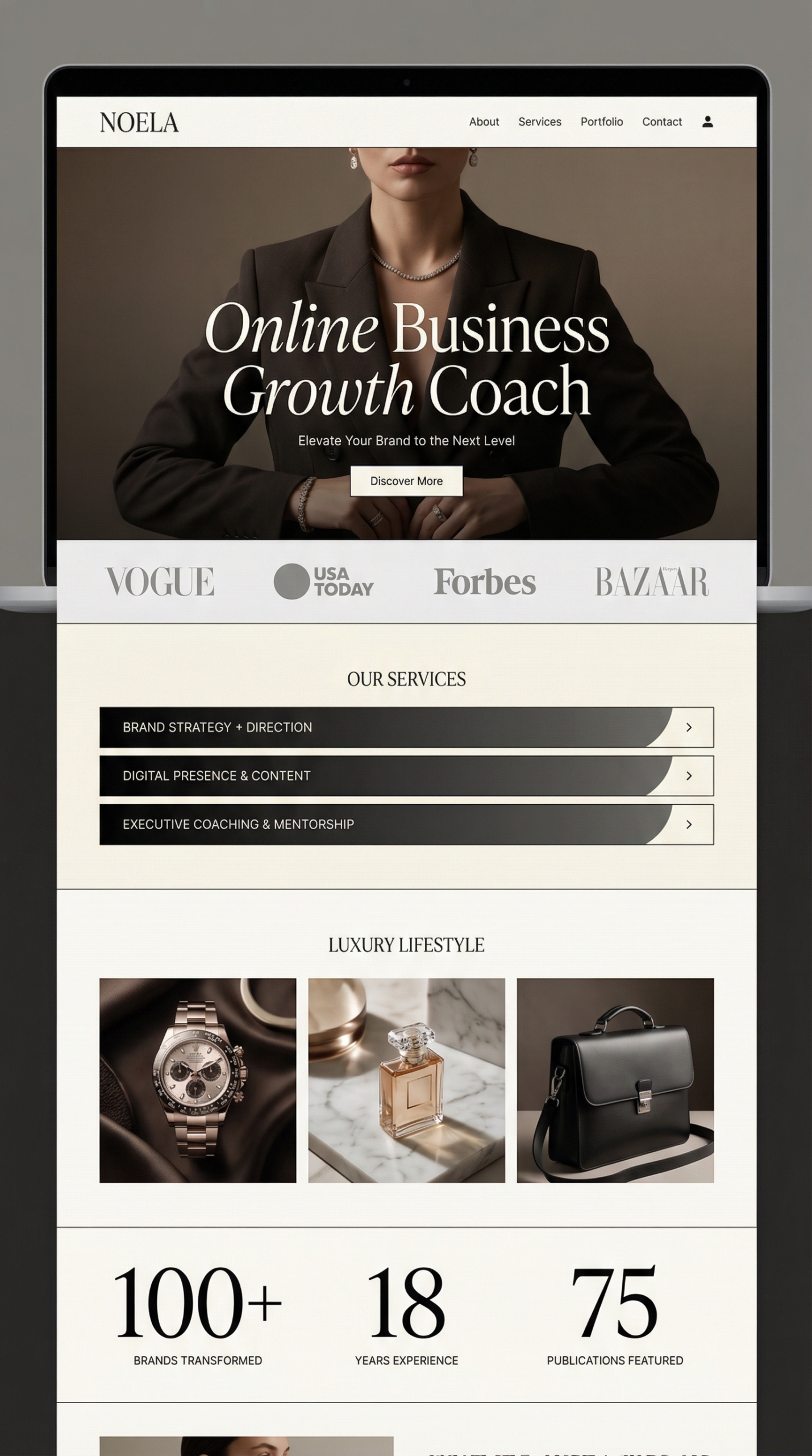 This elegant website template is ideally suited for online business coaches and luxury service providers. Featuring a sophisticated color palette of soft neutrals and deep tones, it emanates a sense of professionalism and modern luxury. The sleek typography and clean layout enhance readability and user experience, while visually striking images underscore a high-end lifestyle. With sections dedicated to services and credentials, this design effectively showcases expertise, fostering trust and engagement. Elevate your brand to new heights with this polished and contemporary website that effectively communicates your values and offerings to discerning clients.