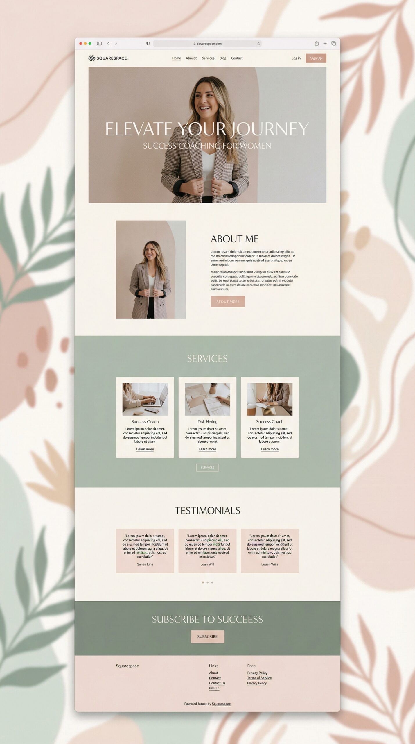 Introducing a stunning website design ideal for success coaching businesses targeting women. This template features a soothing color palette combining soft pinks and calming greens, evoking a sense of serenity and empowerment. The layout is clean and modern, allowing your content to shine while creating an inviting atmosphere for visitors. Emphasize your unique services with beautifully arranged sections for testimonials, making it easy for potential clients to connect with your message. This design not only enhances your brand image but also fosters trust and engagement, ensuring your clients feel inspired to elevate their journey with you. Perfect for coaches, consultants, and wellness professionals!