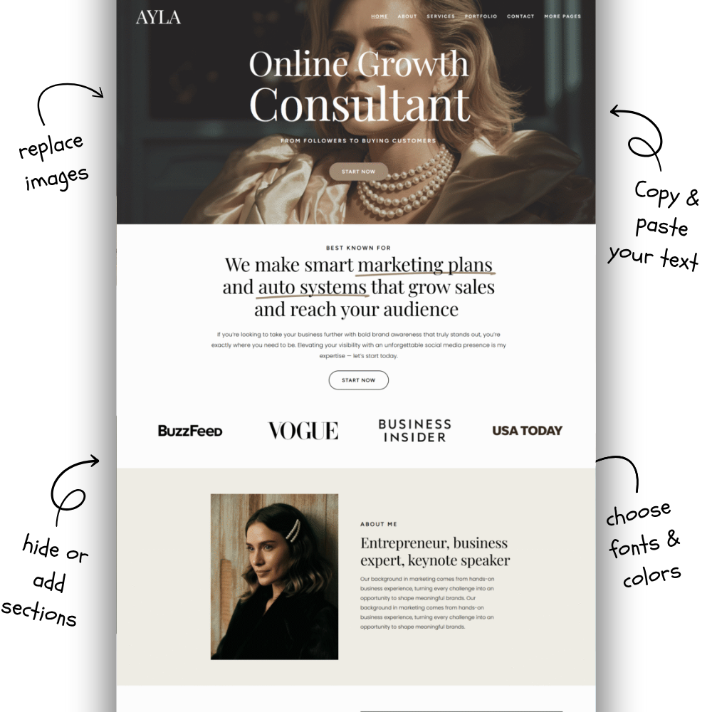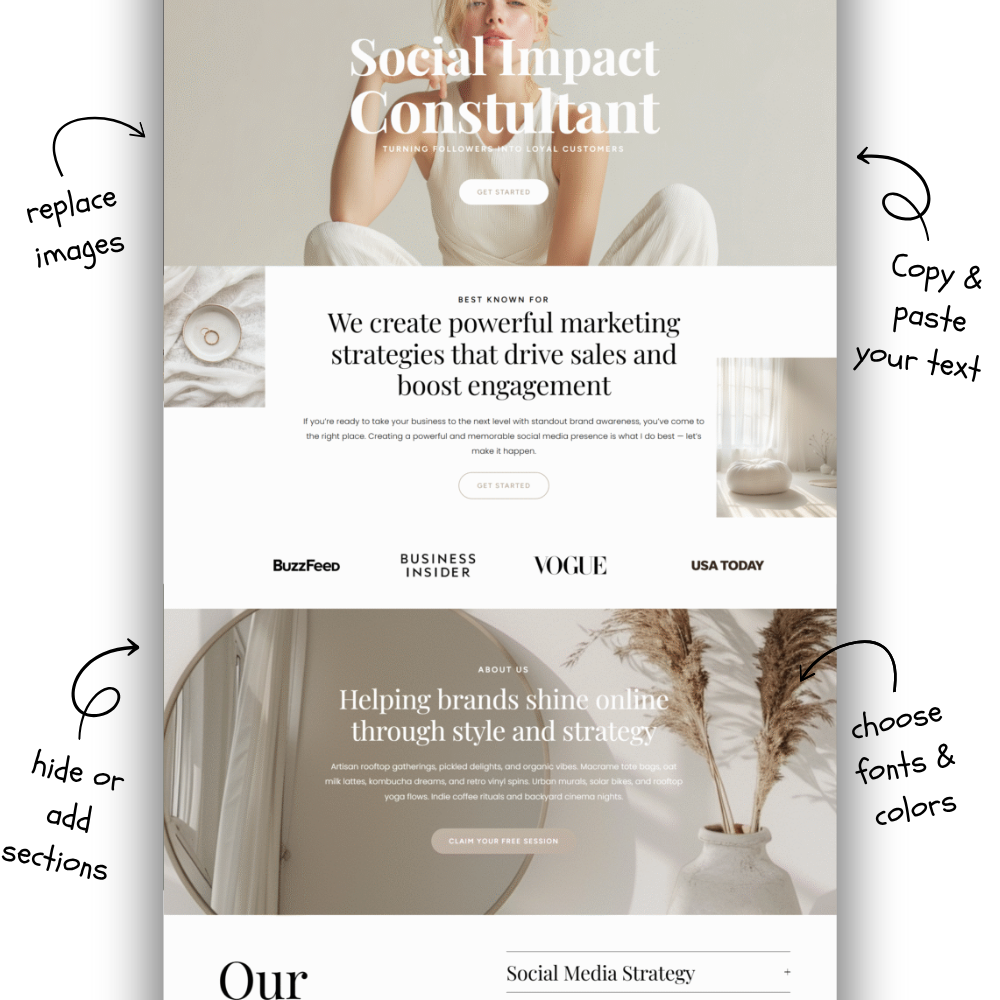 This layout radiates elegance and professionalism, with a soft, minimal aesthetic that immediately builds trust.